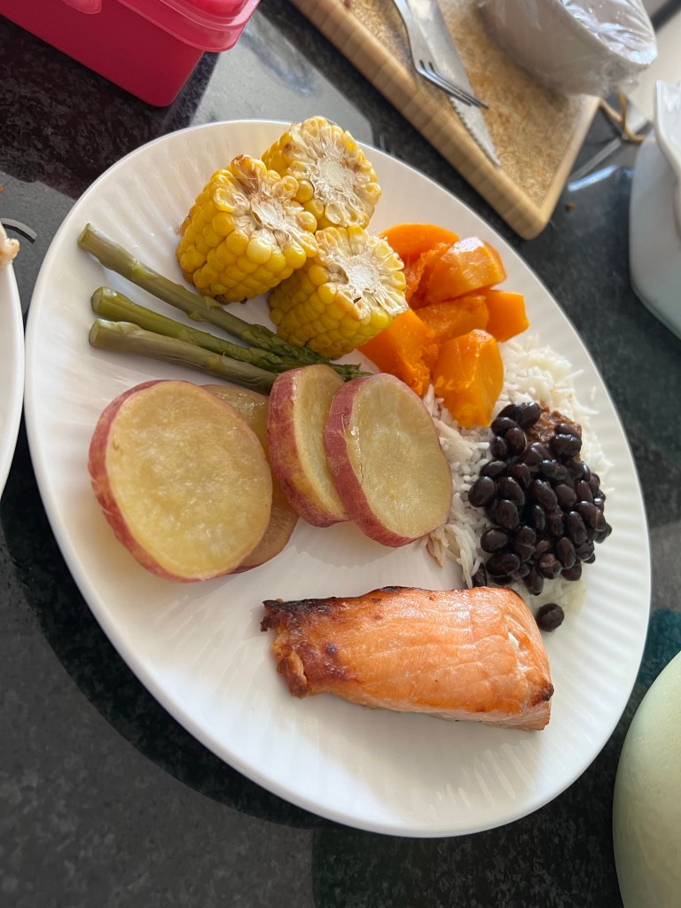 Asparagus, black beans, Butternut, basmati rice, Sweet Potato 🍠, Sweet corn 🌽, salmon 🍣