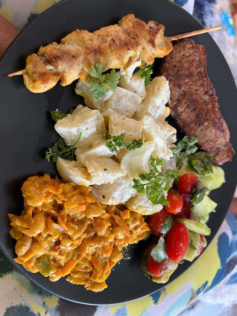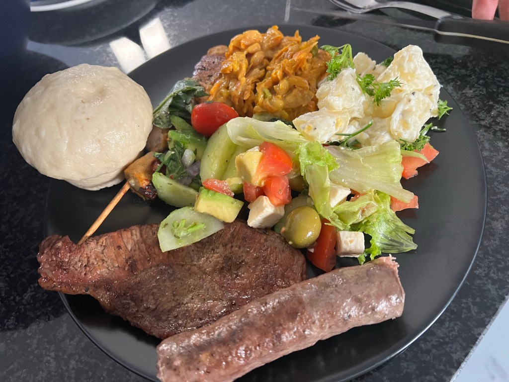 Avo basil tomatoes cucumber onion salad, chicken kebab, chakalaka (baked beans, green pepper π« , onion π§ and Carrot π₯ ) beef π₯© steak with potatoes π₯ boiled egg mayonnaise parsley salad